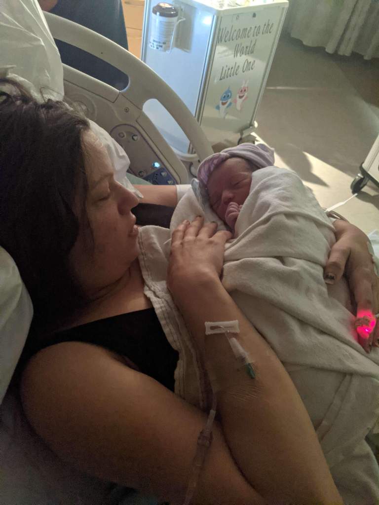 Lena was born at 6:58 am, weighing in at 6 pounds 12 ounces. I know I should talk about how magical it was, but after a few sweet moments with her in my arms, all I could think about was how exhausted I was. I started immediately panicking thinking about having to do it again, and asked them if I could have more/stronger medication. They called the anesthesiologist back in and by this time it was a different one. He gave me some fentanyl and I dozed in and out for about 45 minutes while Rome did skin to skin with Lena. I felt guilty, but I was literally too tired to hold her safely. Every time I opened my eyes, I could see the two of them cuddling, and that was a beautiful vision I’ll never forget.