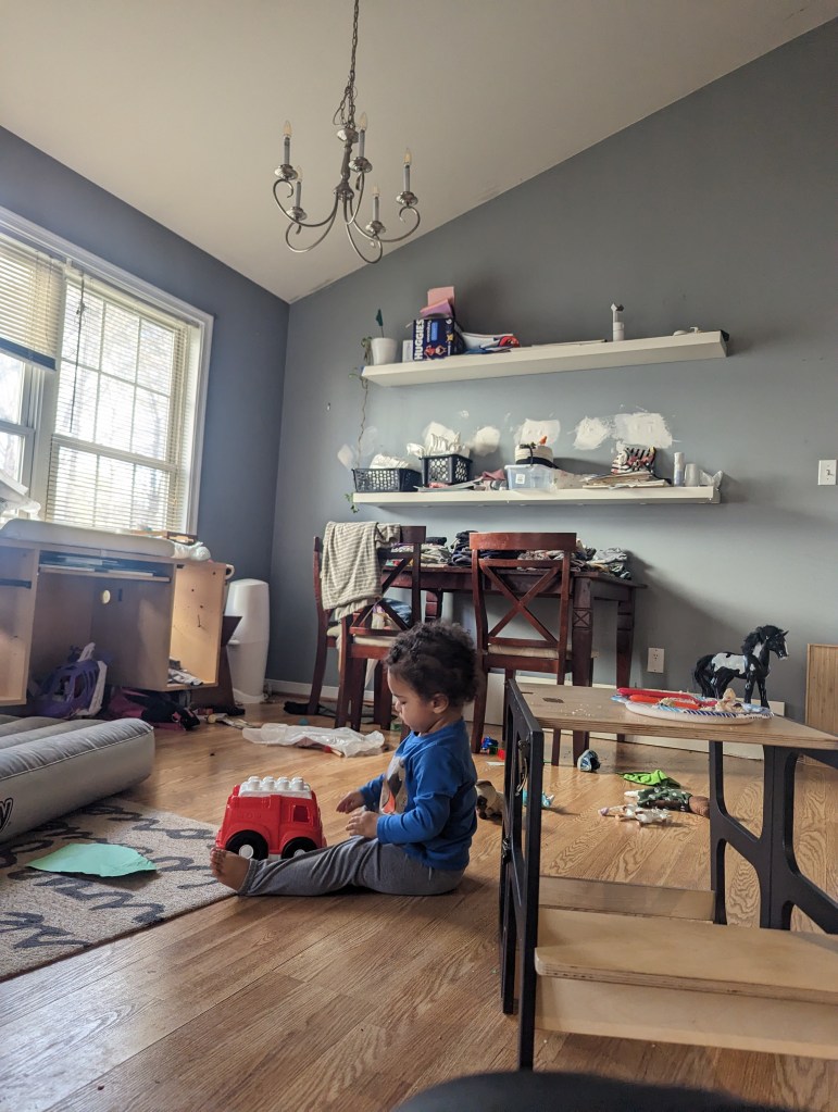 2. Having a staging area. Because we weren’t really eating family meals all together, (hello twin toddlers) half of the dining room table and one of the shelves above it became home to our “out” pile. When I was able to multi-task, having a landing zone for anything that needed to go also meant I didn’t have to sort it or deal with it at that moment-just make a decision and add it to the pile.